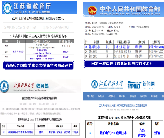 坚持“以本为本”,把人才培养的质量和效果作为检验一切工作的根本标准。坚持依托行业、特色办学,以工程专业认证为抓手,积极探索本科生创新、工程能力培养体系构建、专业核心课程体系改革、人才培养方案重构、分类培养模式探索和校企协同育人。获批国家一流课程1门,省一流课程1门,省留学生全英文授课省精级品课程2门。新增省重点教材1部,省微课教学三等奖1项。获教育部产学合作协同育人项目1项。获省优秀本科毕业设计一等奖、二等奖、三等奖各1项,省优秀本科毕业设计团队1个。获批江苏省研究生科研创新计划项目和研究生实践创新项目21项。水声工程通过新专业评估,完成自动化、电子信息工程2个专业的认证自评报告。国家级教学成果奖培育:总结撰写“铸大国重器 育一流人才 —— 卓越船舶工程师培养的江苏科技大学实践”。成立了11个教学团队—— 依托团队开展教学改革研究,课程思政建设。