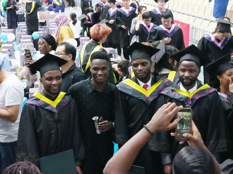 乐声渐弱,掌声雷动。导师们身着导师服上台站定,庄重的学位授予仪式正式开始。毕业生身穿学位服,依次上台领取学位证书,学位委员会全体导师为他们拨穗正冠、颁发学位证书并合影留念,学位授予仪式圆满完成。在亲友的搀扶下,一位拄着拐杖的毕业生上台接受拨穗,大家纷纷为他加油喝彩,毕业典礼“一个都不能少”的满满“仪式感”被推向高潮。台下,毕业生们与挚友相携、与父母相拥,合影留念,用相机定格美好的瞬间。