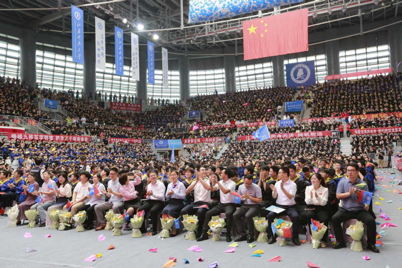 校党委书记葛世伦,校长周南平,学校1995届校友、中船九江海洋装备(集团)有限公司党委书记、董事长程柏林,校领导景旭文、汤建、王加友、郑培钢、谈镇、任南、胡爱祥,校党委常委周春燕、刘新波,江苏科技大学学位委员会委员、相关职能部门领导、2023届全体毕业生、辅导员、班主任,导师和教职工代表,家长代表、校友代表,热情相聚,深情话别。校党委常委、副校长潘锦全,组织部部长李恒川在张家港校区分会场出席典礼,张家港校区相关部门、部分教师、家长代表、毕业生580余人参加了现场典礼。