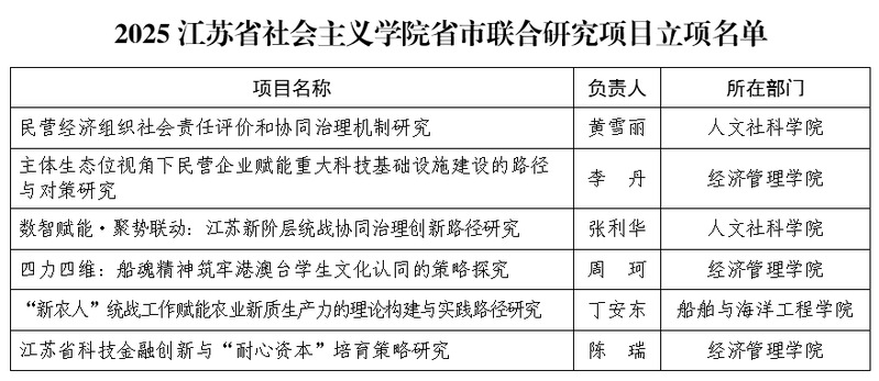 近日,江苏省社会主义学院公布了2025年度省市联合研究项目立项名单,我校6个项目获批立项,数量位居全省第一。
