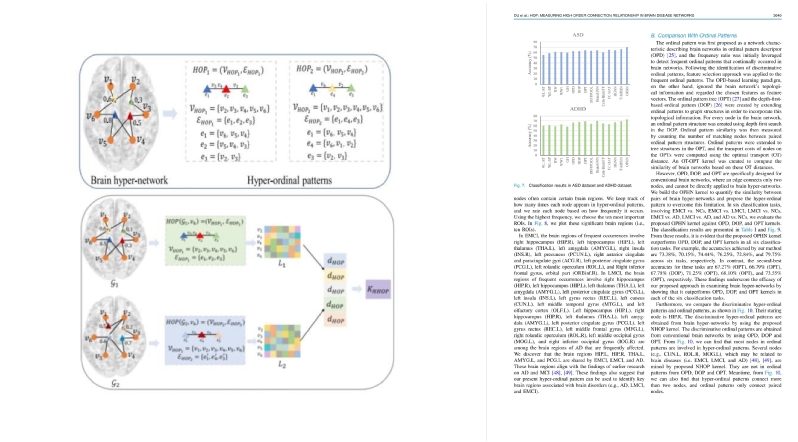 在杜天宇同学为第一作者撰写的论文《Hyper-ordinal Pattern: Measuring High-order Connection Relationship in Brain Disease Networks》中,江苏科技大学为第一署名单位,学院马凯博士为论文通讯作者。该研究针对脑科学领域中,现有脑网络分析方法大多忽略了脑超网络中蕴含重要权重信息的超边连接关系问题,提出了一种新型脑超网络表示方法——超序模式(HOP)。通过引入带有权重信息的超边有序模式关系,来构建脑超网络的HOP。并提出了节点HOP核函数来度量脑超网络中的节点相似性。文章进一步提出了序模式超网络(OPHN)核用于计算脑超网络的相似度,并在MCI和AD等脑疾病分类任务中明显优于超图神经网络等当前最先进的方法。该论文已发表在《IEEE Transactions on Neural Systems and Rehabilitation Engineering》上,是神经科学与康复工程领域的顶级学术期刊之一,属于IEEE出版的系列期刊,其影响因子为5.2,属于中科院二区,JCR Q1。