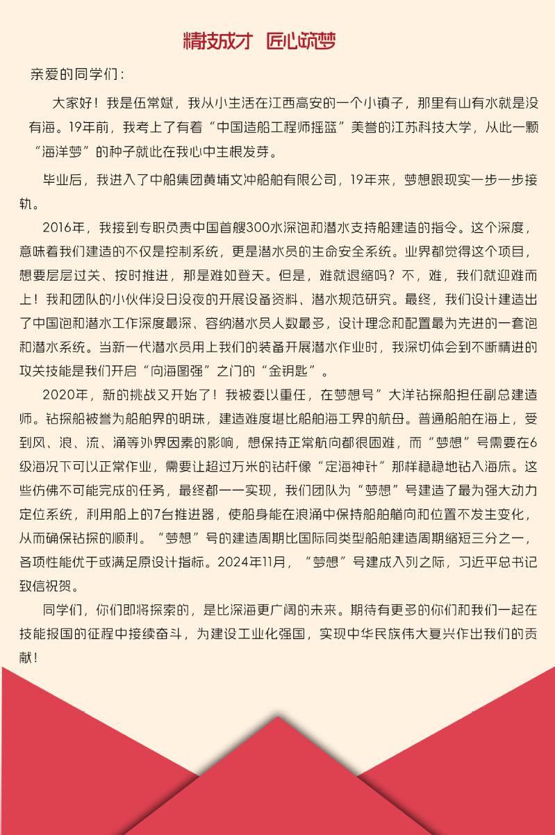 今年的“开学第一课”以“青春与祖国同行”为主题,以一堂“思政大课”的形式,邀请13位高校师生代表,分别在“生逢其时”“青春有为”“强国有我”三个篇章,讲述他们与祖国同行的青春故事。伍常斌作为“强国有我”篇章的演讲嘉宾,以《精技成才 匠心筑梦》为题,用“开拓创新、团结协作、攻坚克难、勇攀高峰”的“梦想号”精神和全体大学生共勉,勉励学子在技能报国的征程中接续奋斗,为建设工业化强国,实现中华民族伟大复兴作出贡献。